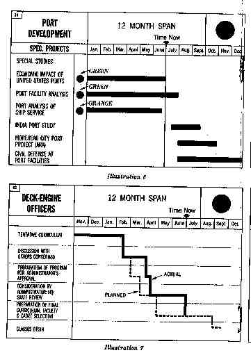 A uniform system of progress charts has been developed also for the use of lower levels of management to show the progress of their activities against predetermined goals. This system represents another management tool used by the Maritime Administration for the direction and control of its activities, through the use of visual aids.